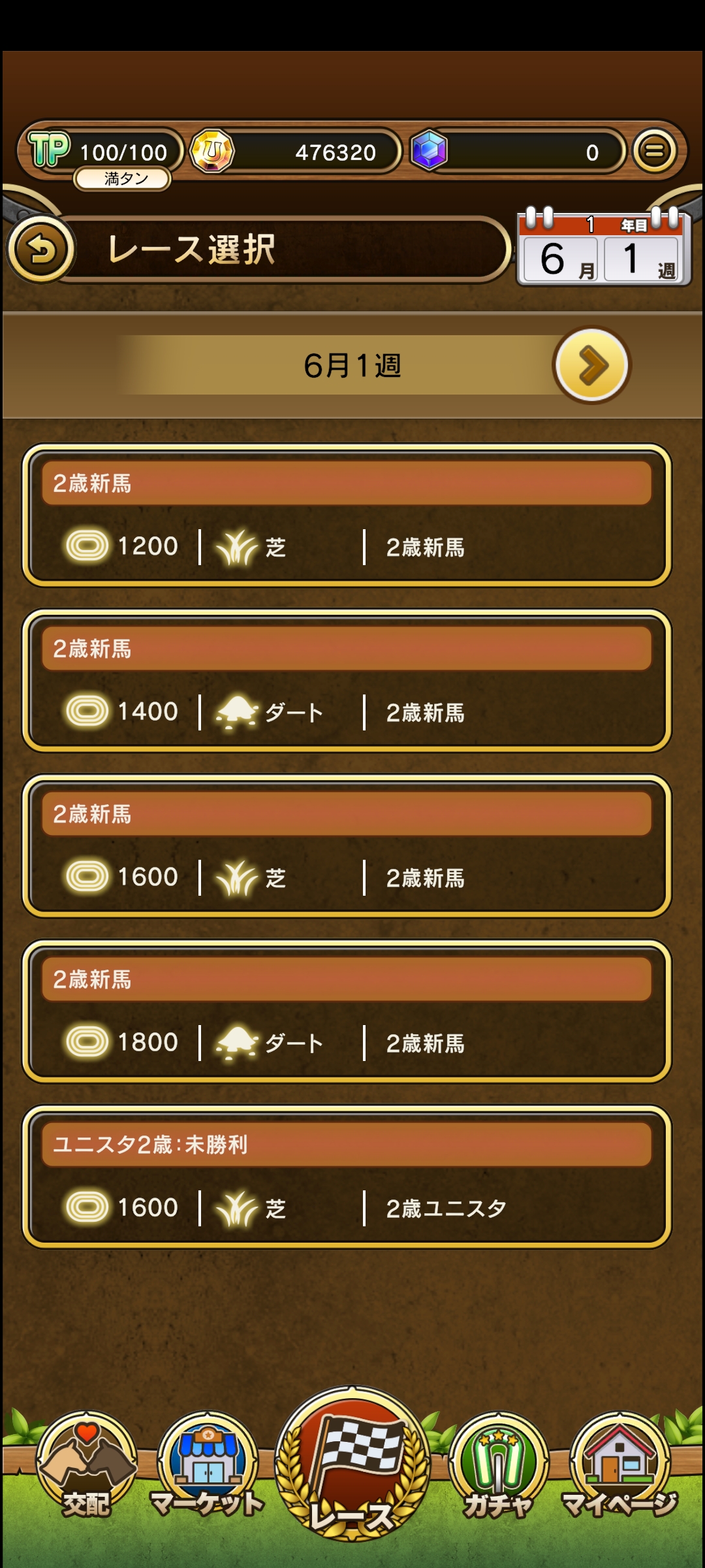 各レースには名称、出走条件、レース距離、芝ダートが表示されていますので、競走馬に適したレースを選択して出走しましょう。